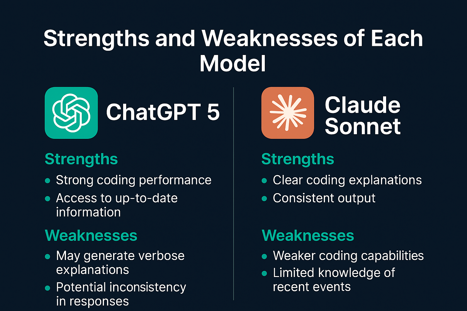The comparison highlights distinct strengths and weaknesses for GPT-5 and Claude Sonnet, making them suitable for different use cases: